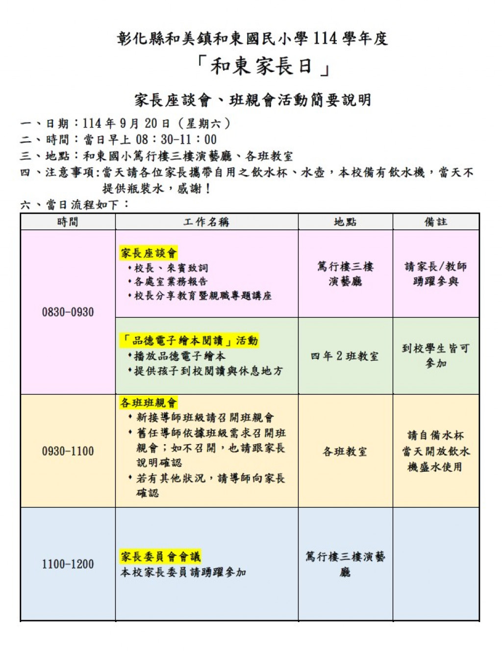 三、地點︰和東國小篤行樓三樓演藝廳、各班教室