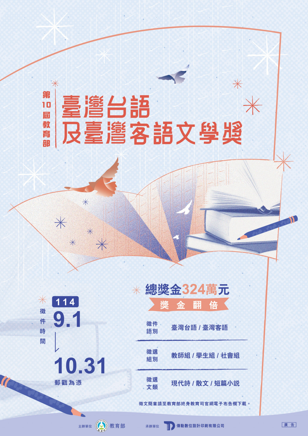 首揭文學獎徵稿期程自114年9月1日起至10月31日止,活動新聞稿、簡章及海報,請參見附件。另有關旨揭文學獎歷屆得獎作品集,已公布在「教育部語文成果網」(https://language.moe.gov.tw/)—「語文推廣類」—「臺灣本土語言文學獎」單元項下。